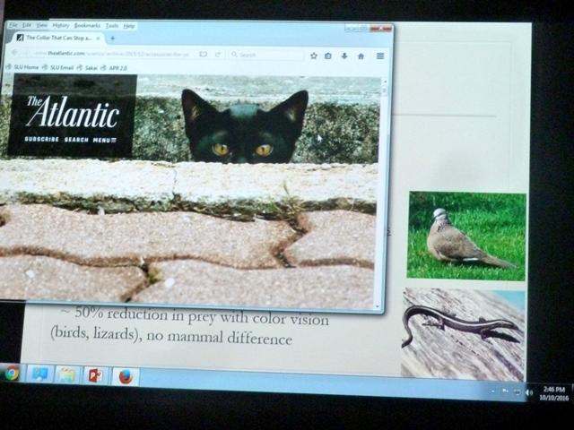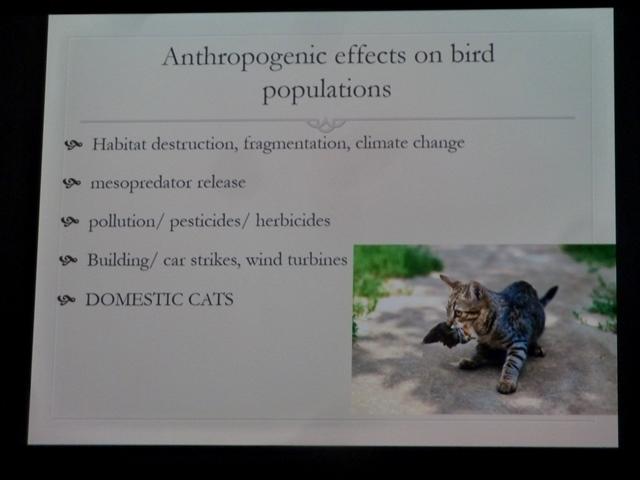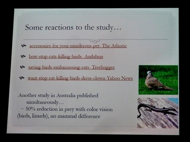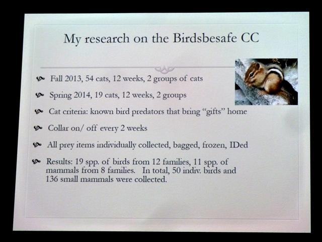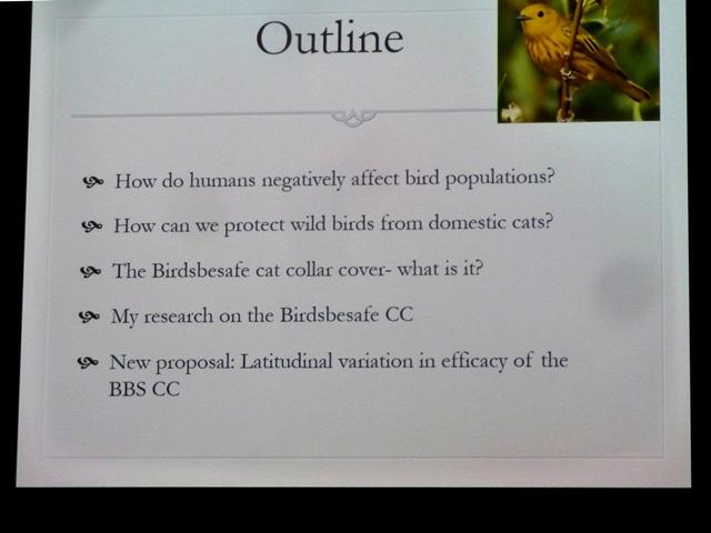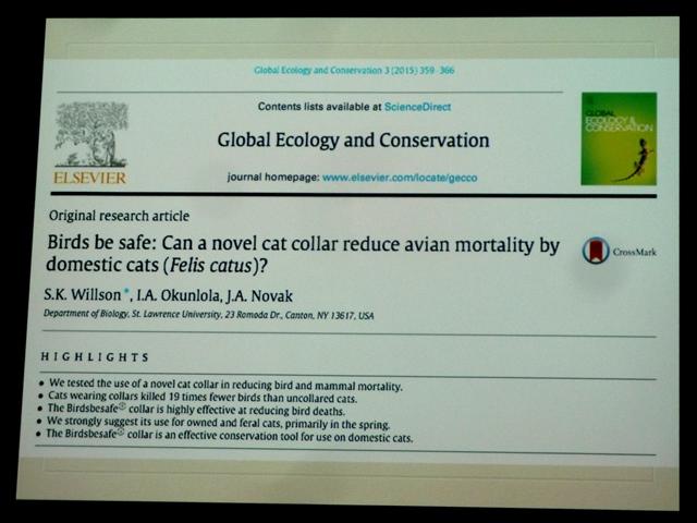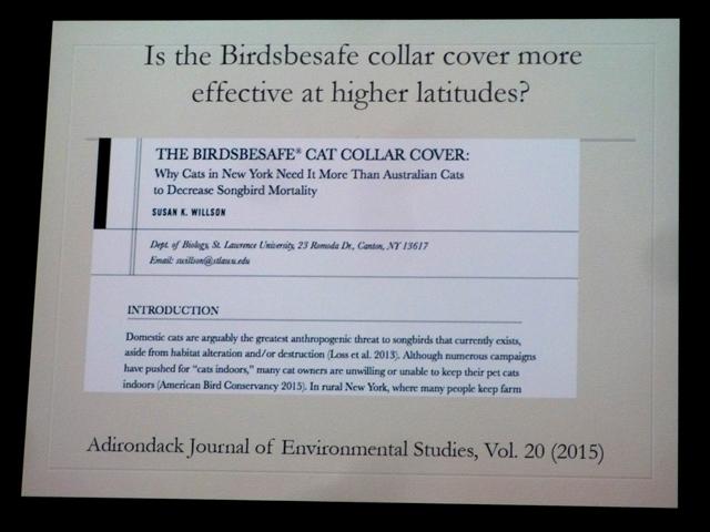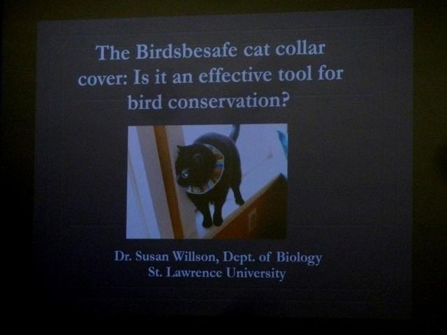 Domestic cat predation on songbirds is arguably the greatest anthropogenic threat that birds face today. Come learn about our study of the Birdsbesafe® cat collar cover, which is a cheap, colorful, and extremely effective collar that cats can wear to reduce bird predation. We’ll examine results of the presenter’s study of the collar with 54 North Country cats, as well as her hypothesis for latitudinal variation in the effectiveness of the collar. If you love songbirds, but also love your outdoor cats, you need to come to this talk!