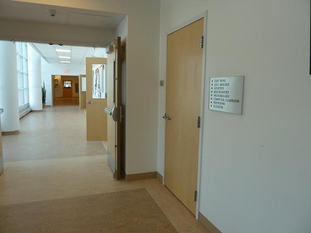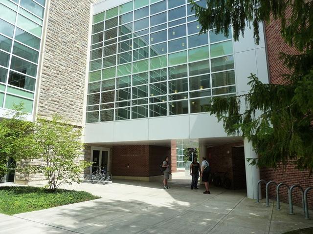 DESCRIPTION / DIRECTIONS: Johnson Hall of Science, is the newest science building on campus. It a two-story, U-shaped, modern (red brick, lots of glass) structure built around a small outside plaza. It is squeezed into the new center of the campus near the new student union and the main dining hall in Sykes Residence Hall. Johnson Hall sits downhill at an angle to Park St. and the other buildings around it. Johnson 244, a lab classroom, is on the second floor in the middle of the corridor closest to Park St. if you are coming from "J" lot (the closest parking lot to the science buildings), enter Johnson Hall at the second doorway (at the breezeway shared with Bewkes Hall) and turn right and take the elevator (or nearby stairs) to floor 2. Back-track left over the bridge to the corridor closest to Park St., turn right - room 244 is on the left halfway down this hallway. If you are coming from "H" lot (a longer walk passing by many campus buildings), enter the central doorway that faces the new student union, turn right and take the stairs to the second floor; walk about halfway down the long corridor to find Johnson 244 on the right.