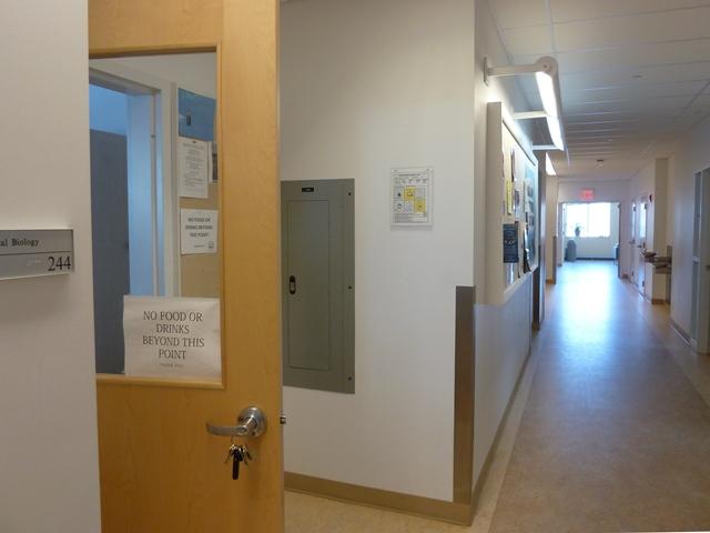 RESTROOMS: Restrooms are in the opposite corridor; from room 244 walk down the hall (i.e. towards the center of campus); turn right, pass through the short corridor, turn right into the opposite long corridor; restrooms are immediately on your right.