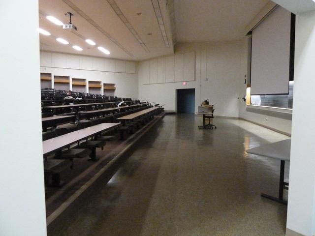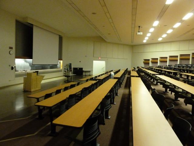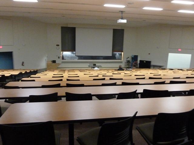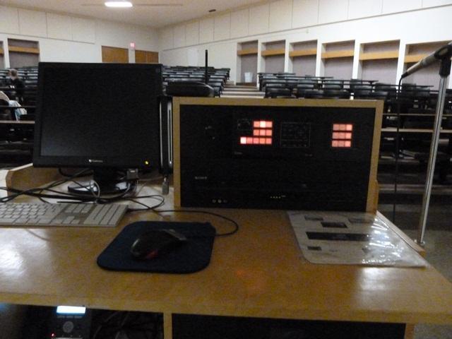TECH and OTHER EQUIPMENT: Ceiling mounted digital projector, 1 dual boot computer in podium, DVD and VCR, network input, USB port cable and VGA cable with audio jack (for use with one's own laptop)