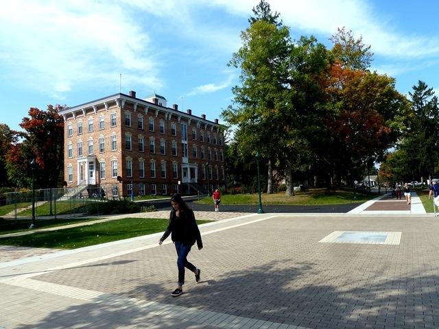 DESCRIPTION / DIRECTIONS: Richardson Hall, one of the oldest red-sandstone buildings, is located on the side of campus nearest downtown Canton. Parking, however, is on the far side of campus (see below). Richardson houses the English Department. From lot J, walk up the hill on the path closest to Park St.; from lot D, work your way to the pedestrian walk-way between the sports complex and the stadium, and cross Park St. at the Johnson Hall of Science (round oval drive in front) crosswalk. (NOTE: All other crosswalks closer to town also will take you to this pedestrian walk-way.) Take the angled walk leading to the center of campus, passing by the classroom buildings on your left and the length of Johnson Hall on your right; continue on, passing by the student center on the right and Sykes Dining Hall on the left. Keep walking, passing (on the left) Hepburn Hall, Carnegie Hall, the Chapel, and finally arriving at Richardson Hall. Climb the hal-flight of stairs to enter Richardson at the doorway facing the chapel, enter the corridor, Richardson 104 is the second door on the right.