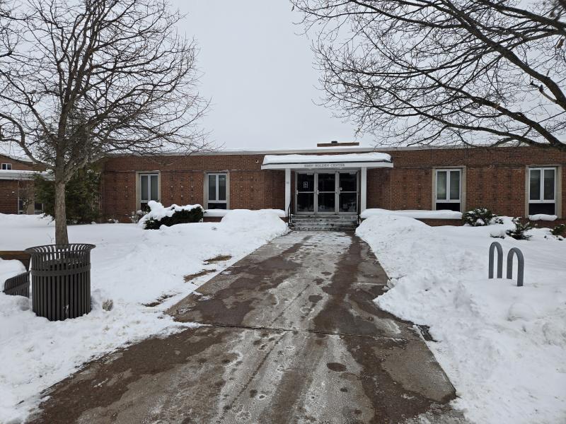 From Parking Lot C: Exit the lot from the northwest side (toward the campus buildings) and walk on the main road to the light brown building. Go to the left side of the building to the main entrance, marked Eben Holden Center.