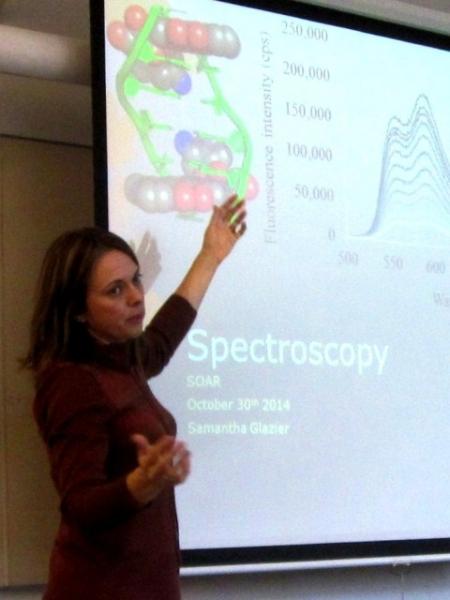 Samantha Glazier is a chemist at SLU where she teaches courses on quantum chemistry and spectroscopy. Her research uses visible light fluorescence to study interactions between anti-cancer drugs and DNA.